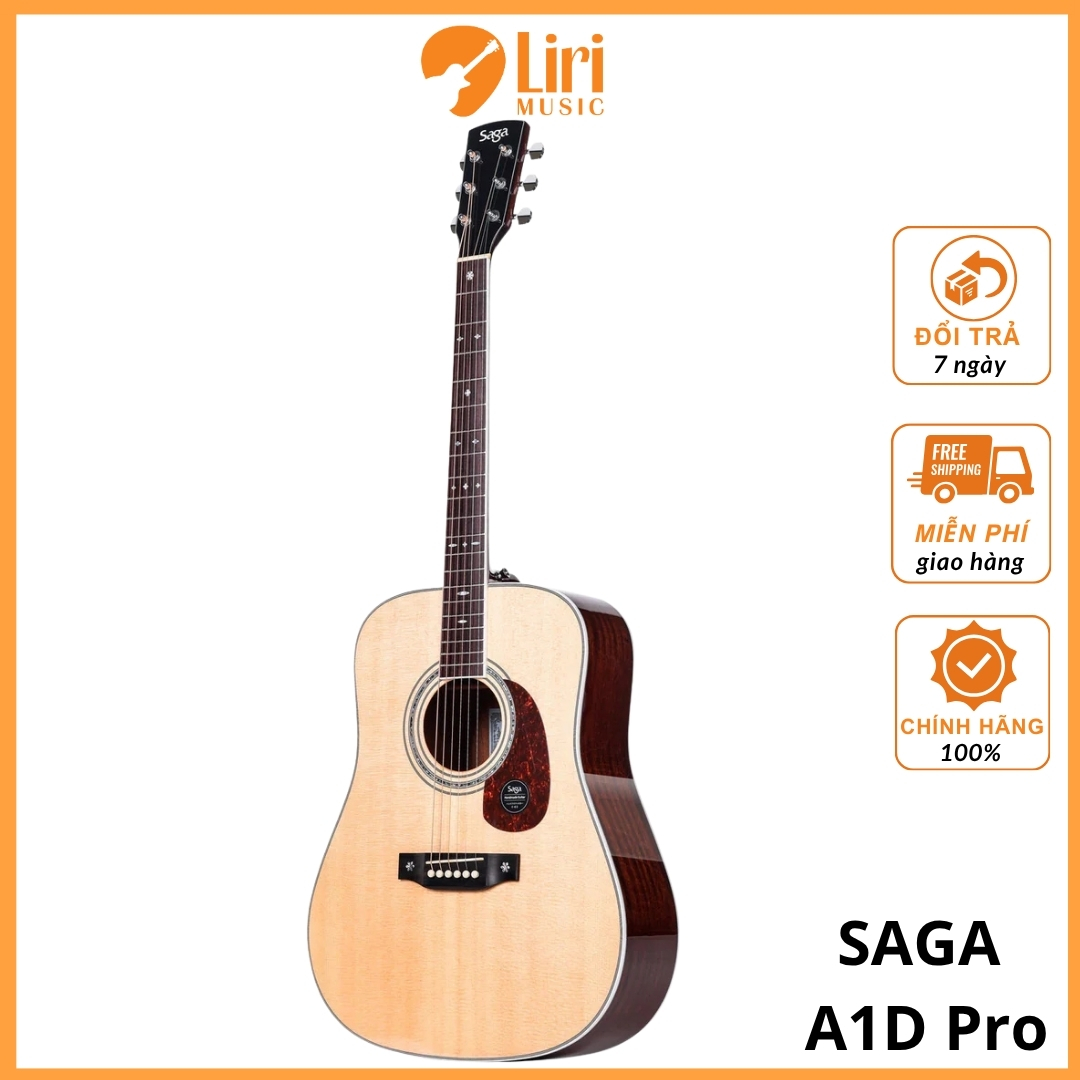 Saga A1D Pro nằm trong Bộ sưu tập ‘Hight-end All Solid Series’ là tuyển tập những cây đàn guitar được xây dựng vật liệu có tính chọn lọc nhất của Saga guitar, model được thiết kế để dành cho người chơi ở mức độ chuyên nghiệp đang muốn tìm kiếm cho mình một cây đàn chất lượng hơn từ cấu hình gỗ cao cấp hơn đến những chi tiết được hoàn thiện một cách tỉ mỉ để làm hài lòng nhất đến người chơi. Kiểu dáng Dreadnought, cùng với đó mặt trên được làm bằng gỗ solid Sitka, phần mặt lưng và hông được sử dụng gỗ solid Sapele, tonewood này là sự kết hợp tuyệt vời giữa chất lượng âm thanh với một mức giá đáng kinh ngạc mà bạn có thể sở hữu ngay cho mình một cây đàn chất lượng hàng đầu của thương hiệu Saga. Cần đàn bằng gỗ Mahogany, mặt phím đàn và ngựa đàn được sử dụng gỗ Indian Rosewood. Cùng với đó là hai màu sắc Natural và Vintage để bạn có thể lựa chọn theo sở thích cá nhân. Cây đàn này tạo ra giai điệu cân bằng tổng thể và là một nhạc cụ dễ chơi, tuyệt vời. Tất cả guitar Saga đều được chế tạo thủ công bởi những người thợ làm đàn có kinh nghiệm cùng với công nghệ xử lý gỗ và máy móc tiên tiến, điều này góp phần tạo nên các sản phẩm tốt được đưa ra thị trường và được sự đón nhận bằng cách cởi mở. Dòng guitar acoustic giá cả phải chăng của Saga có đặc điểm là gỗ tone-wood rất truyền thống thể hiện chất lượng âm thanh tốt. Hoàn hảo cho người mới bắt đầu cũng như người chơi guitar bán chuyên nghiệp hoặc chuyên nghiệp.
