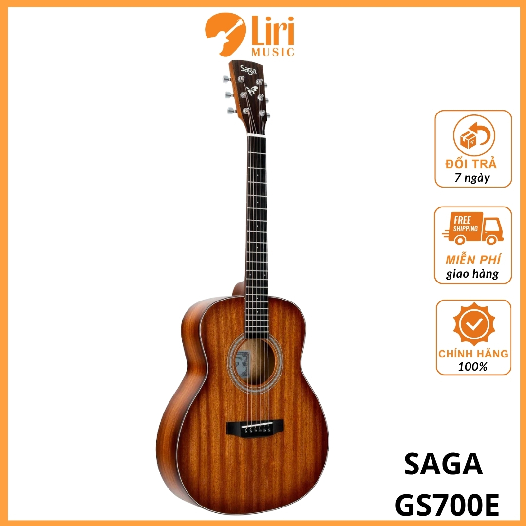 Mặt top làm từ gỗ thịt nguyên tấm Sitka Spruce (đối với phiên bản màu Natural, Vintage) / Sapele (đối với phiên bản Sapele). Lưng và hông làm từ gỗ Sapele. Saga GS700E sở hữu âm thanh tươi sáng, tự nhiên.