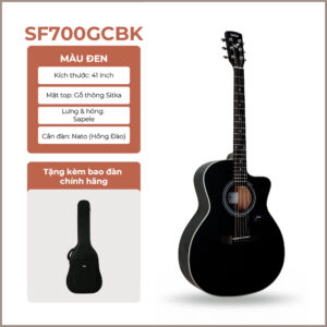 SF700GCBK là một cây đàn Grand Auditorium Cutaway với kích thước 41 inch, phù hợp với nhiều thể loại âm nhạc khác nhau. Thùng đàn lớn mang đến âm lượng mạnh mẽ, âm bass trầm ấm và âm treble vang, sáng rõ. Thiết kế khuyết trên thân đàn giúp người chơi dễ dàng tiếp cận và bấm những nốt cao trên cần đàn.
