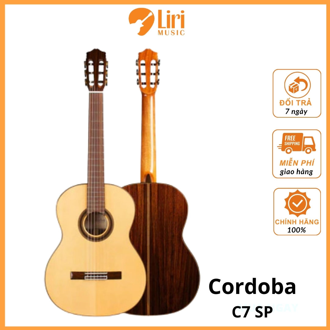 Đàn guitar classic Cordoba C7SP là sự lựa chọn tuyệt vời cho người mới bắt đầu hoặc người chơi guitar bán chuyên. Một bước tiến so với C5 của Cordoba, C7 SP Classical có mặt sau và mặt bên bằng gỗ hồng mộc Ấn Độ với mặt đàn bằng gỗ vân sam châu Âu chắc chắn để tạo ra âm sắc tươi sáng hơn. Thanh giằng quạt truyền thống của C7 cho phép cộng hưởng và duy trì tối đa cùng các tính năng cao cấp như hoa thị bằng gỗ khảm thủ công, thanh giàn có thể điều chỉnh hai chiều và lớp hoàn thiện bằng polyurethane có độ bóng cao bóng bẩy mang lại nhiều giá trị từ ngoại hình thiết kế đến âm sắc của cây đàn.