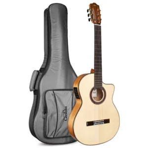 Cordoba GK Studio (kèm bao đàn Cordoba Deluxe Gigbag) kết hợp cảm giác chơi nhanh với các kỹ thuật xây dựng flamenco truyền thống để mang lại trải nghiệm chơi thú vị hơn đối với cây đàn guitar này. GK Studio được thiết kế cho giai điệu, với mặt sau và hai bên bằng gỗ bách (Cypress) với mặt trên bằng gỗ vân sam châu Âu chắc chắn. Cần đàn bằng gỗ gụ mỏng hơn và hẹp hơn một chút so với đàn guitar cổ điển truyền thống để có khả năng chơi mượt mà. Và thân đàn mỏng hơn thoải mái cho người chơi theo bất kỳ phong cách nào. Bạn không chỉ nhận được loại gỗ có tông màu cao cấp, GK Studio còn thể hiện sự chú ý của Cordoba đến từng chi tiết với hoa thị bằng gỗ khảm thủ công và bộ điều chỉnh khoá màu vàng/ đen với các nút bằng gỗ mun. Bạn cũng được tích hợp ngay hệ thống khuếch đại âm thanh Fishman Presys Blend. Đối với một cây đàn guitar dễ chơi, đẹp mắt, bạn sẽ thích Cordoba GK Studio.